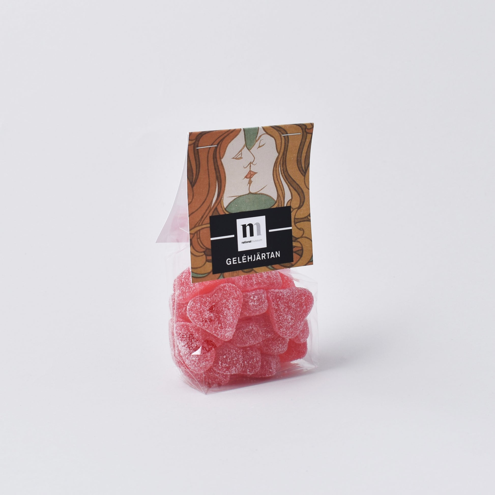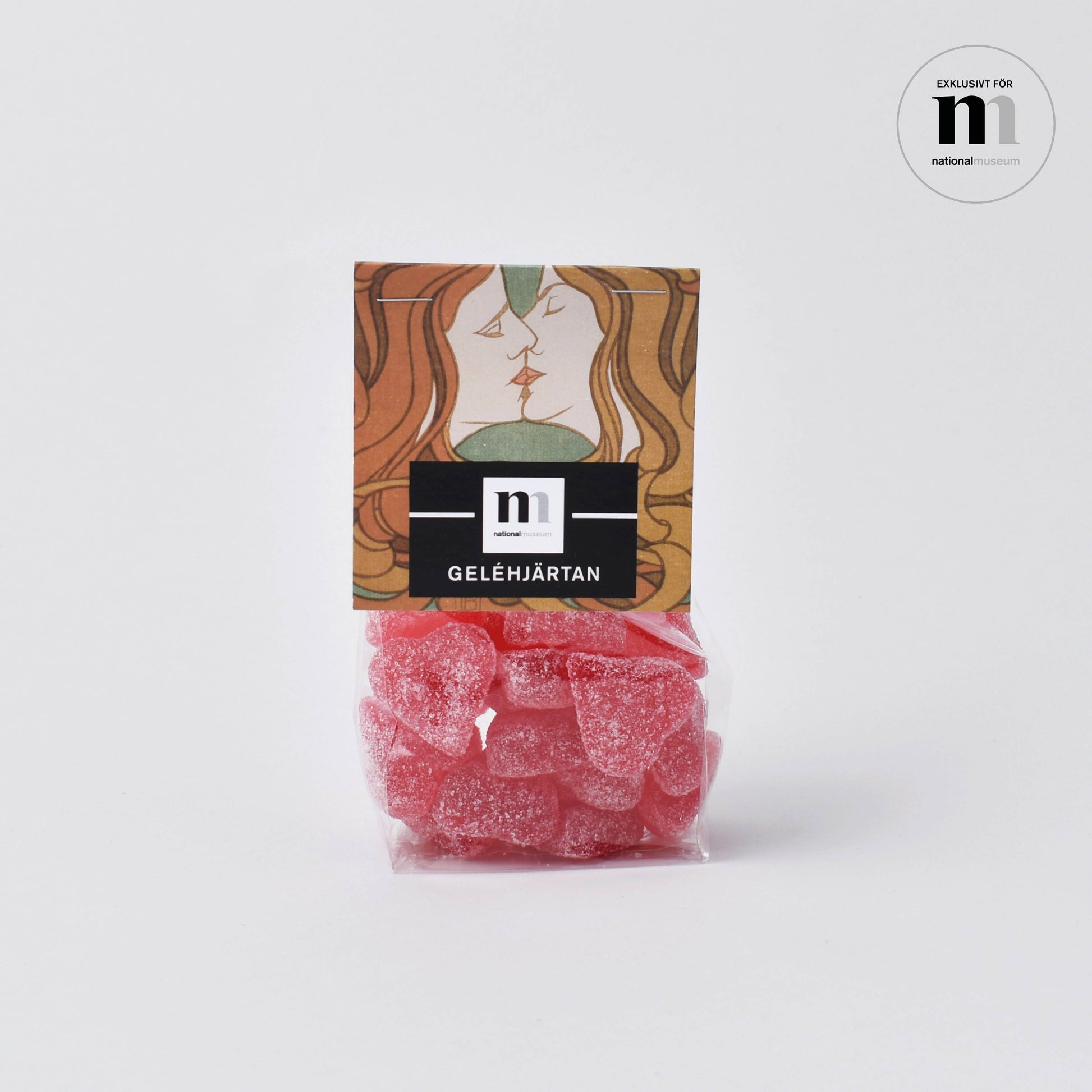 Sprid kärlek med våra goda geléhjärtan med smak av hallon i söt förpackning med motivet Kyssen av Peter Behrens.