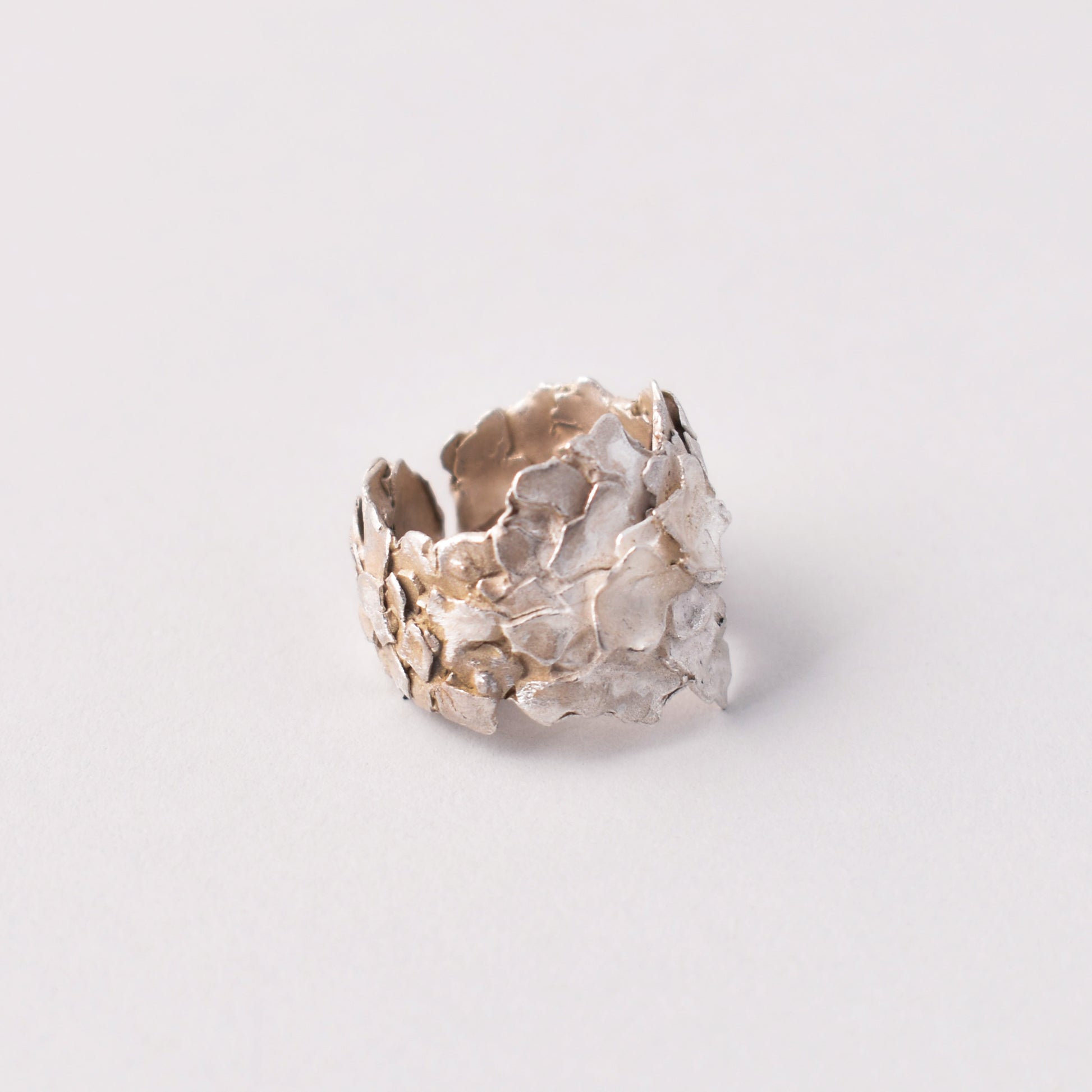 Ringen är uppbyggd av strukturer i silver som efterliknar skogens lavar som växer runt grenar och träd.