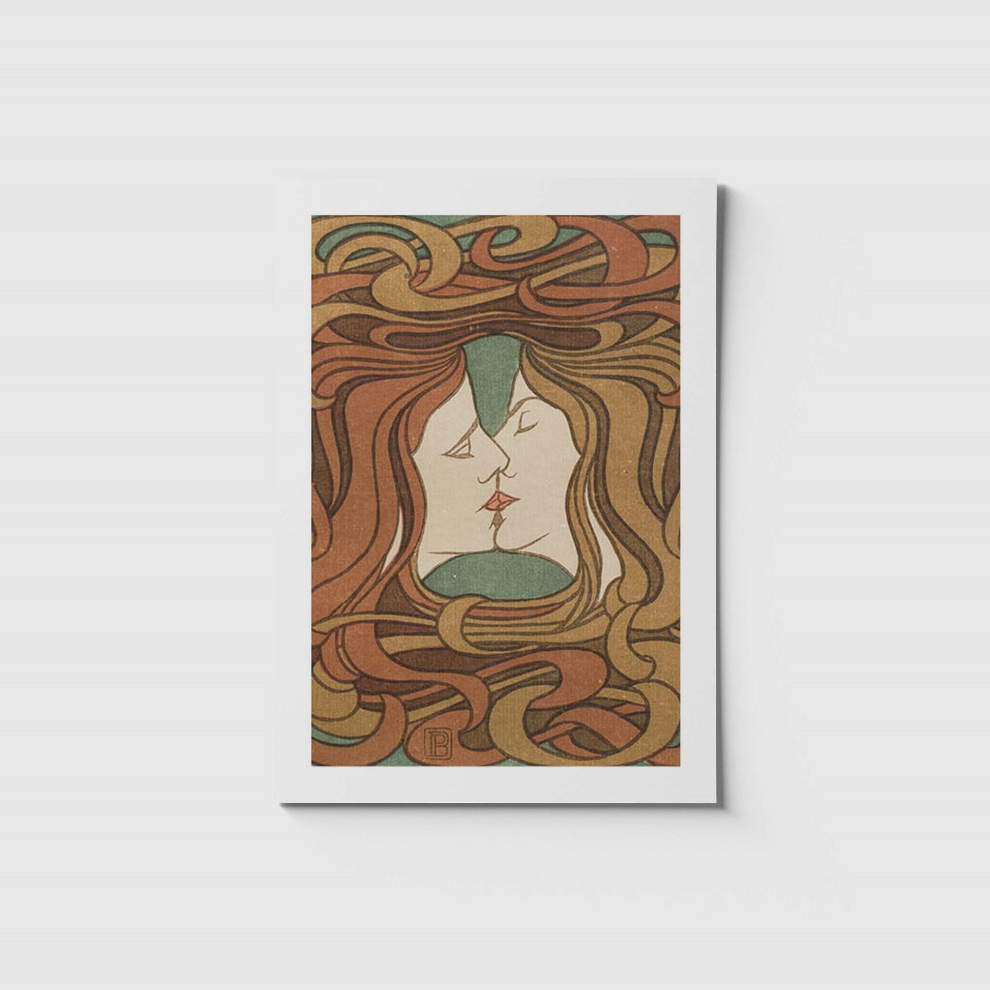 Kyssen är skapad av den tyske formgivaren Peter Behrens med träsnittsteknik. Det vackra motivet skapades 1898 men den grafiska formgivningen känns modern än idag och föreställer två personer som med sina slingriga hår möts i en kyss.